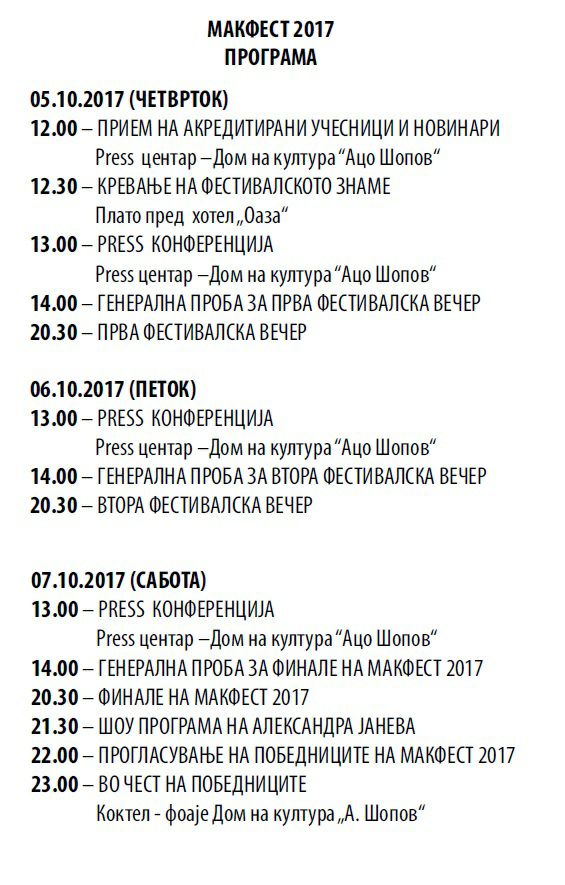 Окт 03 2017 Off Навигација на напис Previous PostPrevious Сепак,зголемен паричниот износ за наградите на Макфест 2017Next PostNext МАКФЕСТ 2017- 32 ИЗДАНИЕ