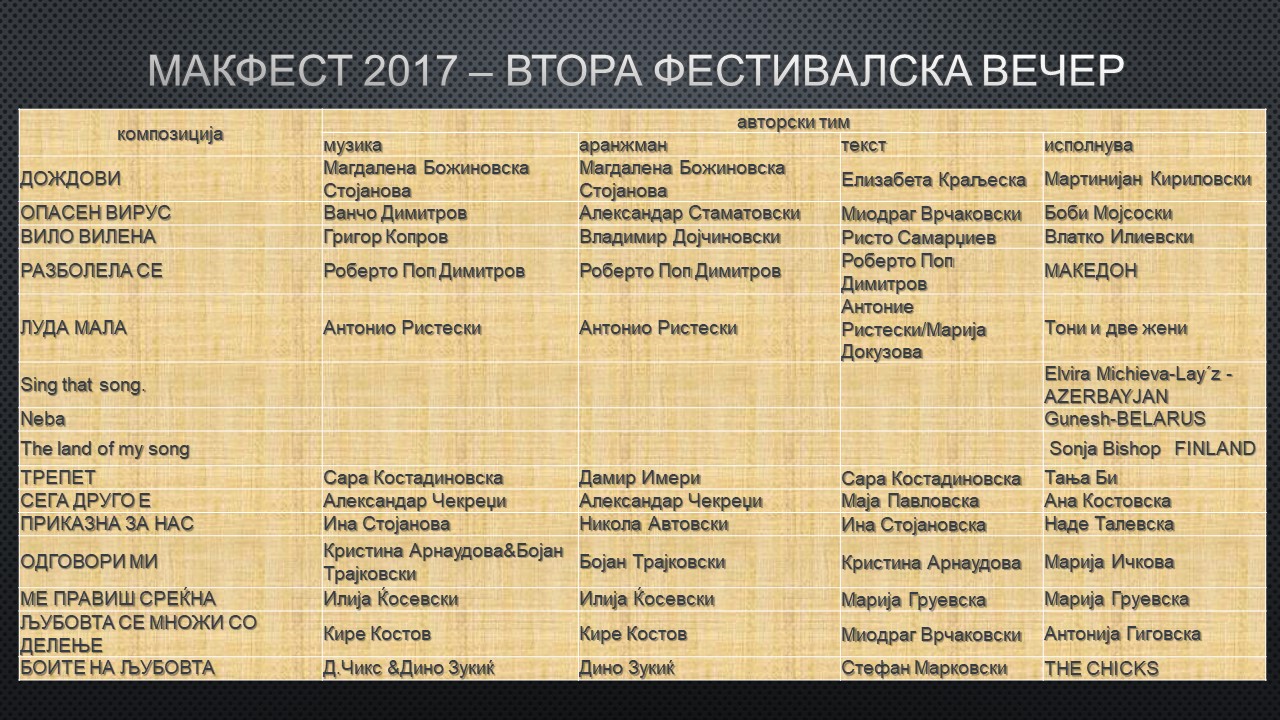 Сеп 21 2017 Off Табелата не распоред по кој ќе се настапува Навигација на напис Previous PostPrevious МАКФЕСТ 2017 – КОНЕЧНА ЛИСТА НА КОМПОЗИЦИИNext PostNext МАКФЕСТ 2017 – ПРВА ФЕСТИВАЛСКА ВЕЧЕР