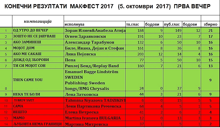 Окт 05 2017 Off По пребројувањето на гласовите од публиката и телевоутингот, по принципот евровизиски бод систем, е направена конечната листа на композиции кои се пласираа во финалето, а кои отпаднаа. Во финалето се пласираа првите 9 композиции Навигација на напис Previous PostPrevious Начин на гласање на Макфест 2017Next PostNext МАКФЕСТ 2017 -РЕЗУЛТАТИ ВТОРА ФЕСТИВАЛСКА ВЕЧЕР