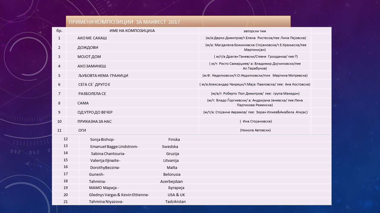 По преслушувањето на 140-те композиции за програмата на Фестивалот на забави мелодии “Макфест“ – 2017 година, уметничкиот директор на Фестивалот Љупчо Мирковски, и членовитена селекционата комисија, одлучија овие композиции да бидат дел од програмата на Макфест